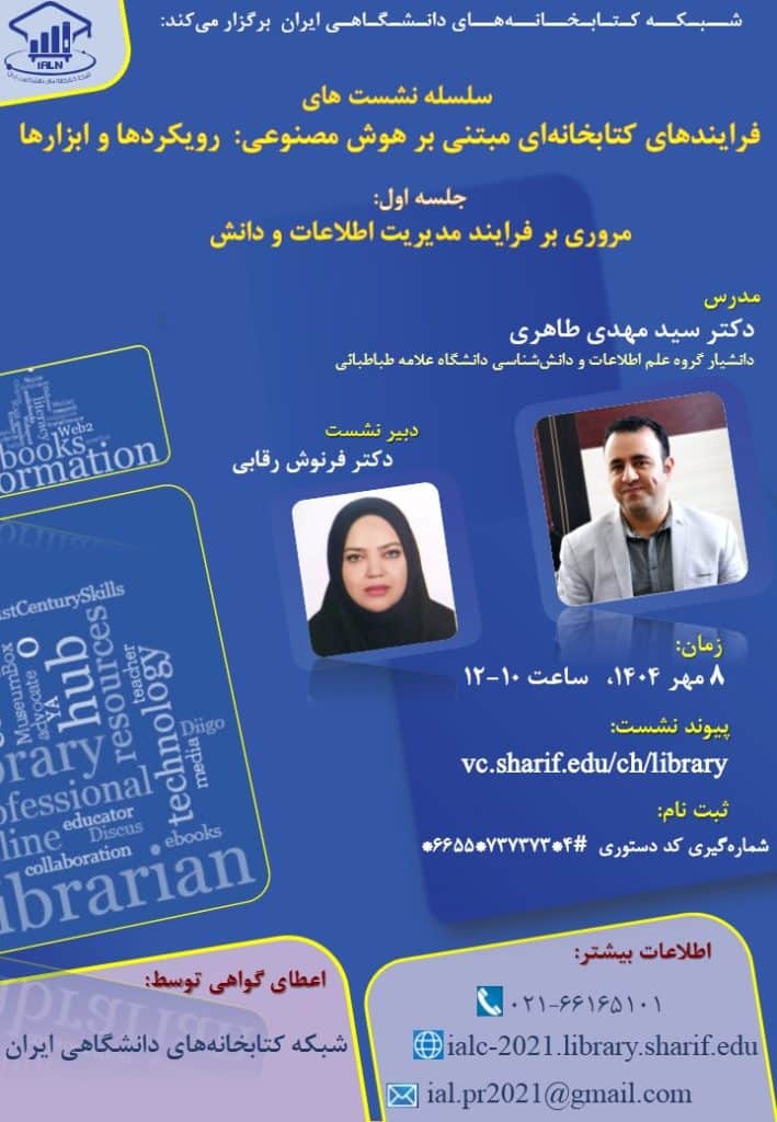 شبکه کتابخانههای دانشگاهی ایران، در تداوم برنامه های آموزشی تخصصی خود، سلسله نشستهایی با عنوان «فرایندهای کتابخانهای مبتنی بر هوش مصنوعی: رویکردها و ابزارها» را با مدیریت و تدریس دکتر سیدمهدی طاهری، دانشیار گروه علم اطلاعات و دانش شناسی دانشگاه علامه طباطبایی به صورت دورهای (هر دو هفته یکبار) به شرح زیر برگزار می نماید: